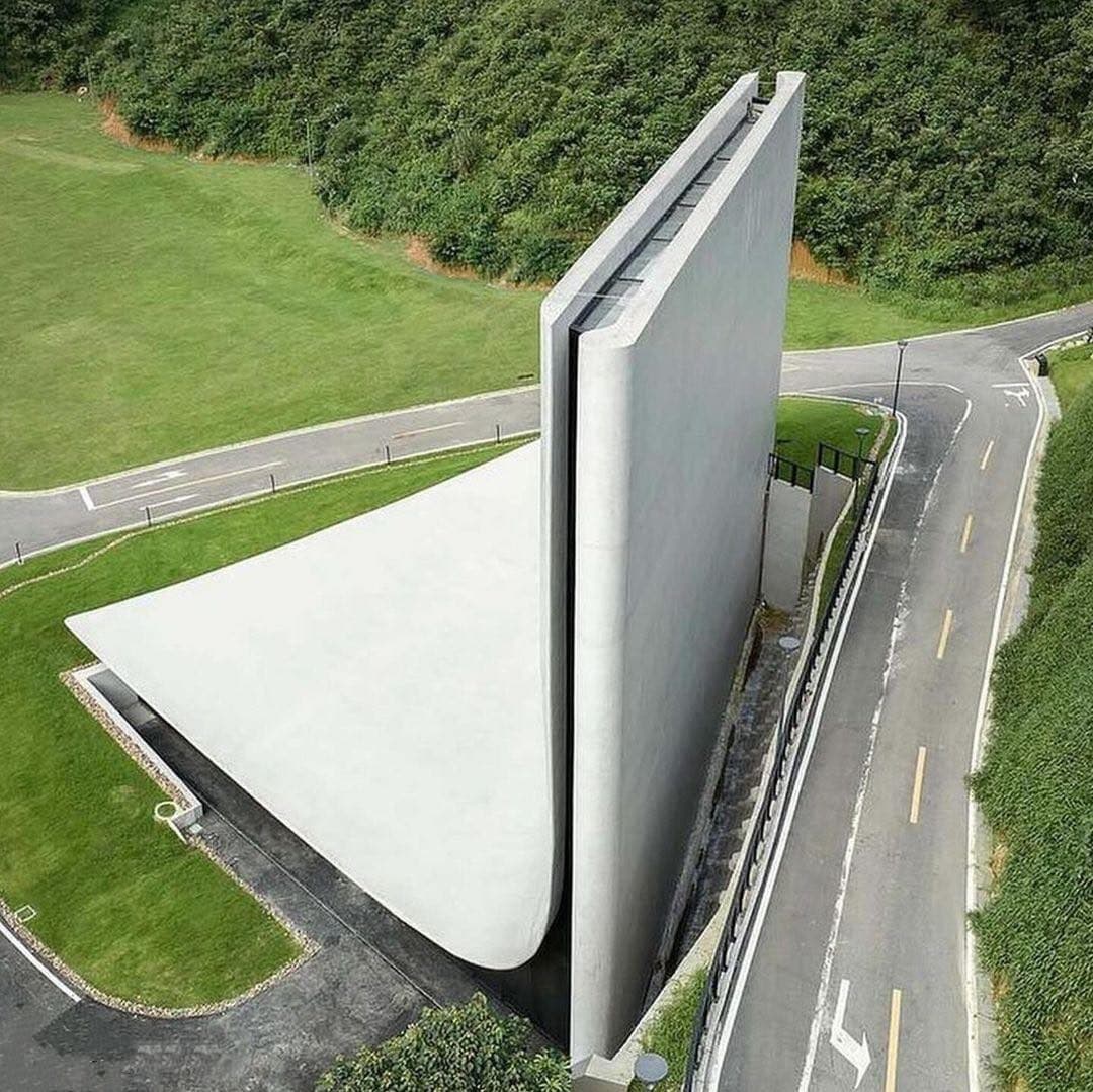 Pencil Sketch of a Modern Building Entrance with Underground Parking Sign, executed in 3-Point Perspective