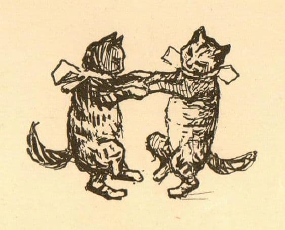 Photograph of a black cat and an orange cat near a laptop