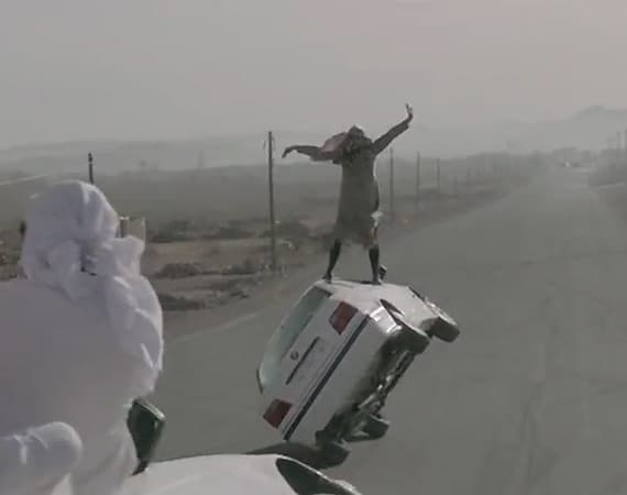 Photograph of a brown leather car seat folded forward inside a vehicle